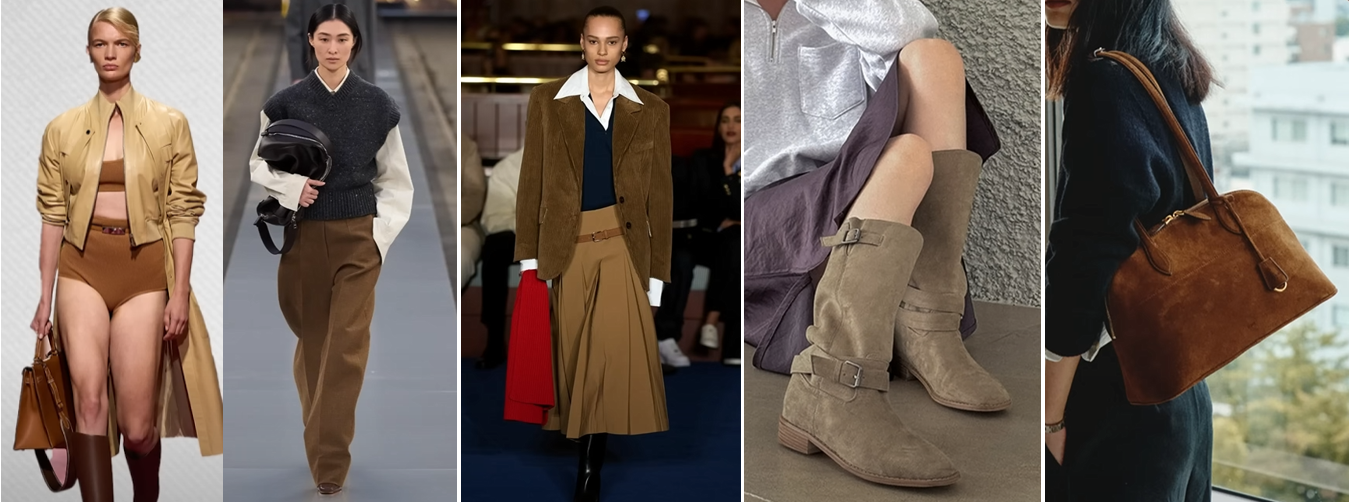 베이지~ 다크브라운 계열로 톤온톤 매치해 주면 세련되고 고급스러운 느낌을 줄 수 있고, 스웨이드 가죽 가방과 신발에서 포인트로 활용하기 좋습니다.